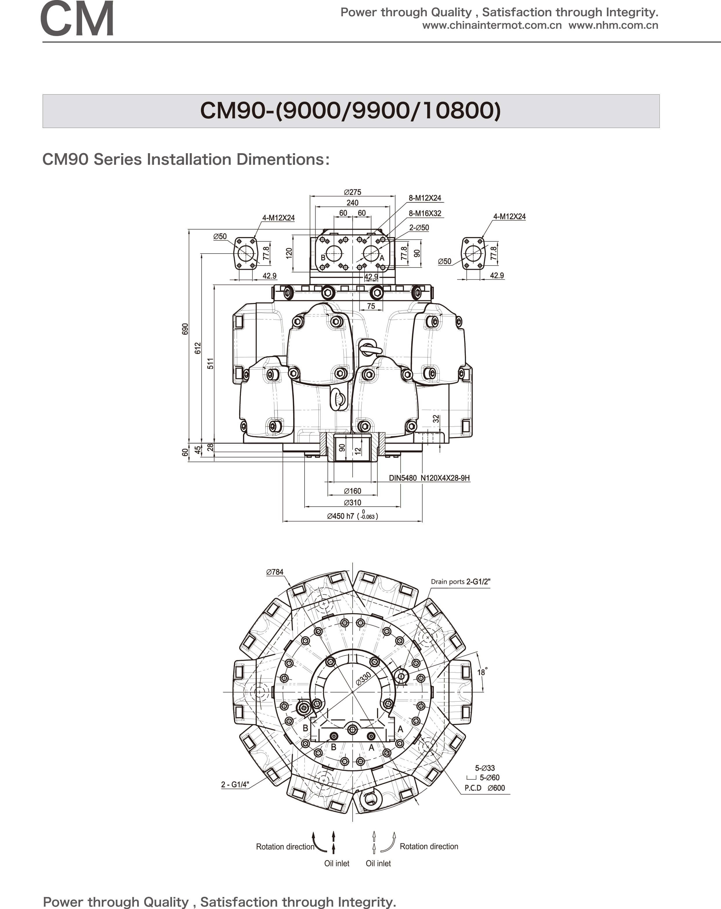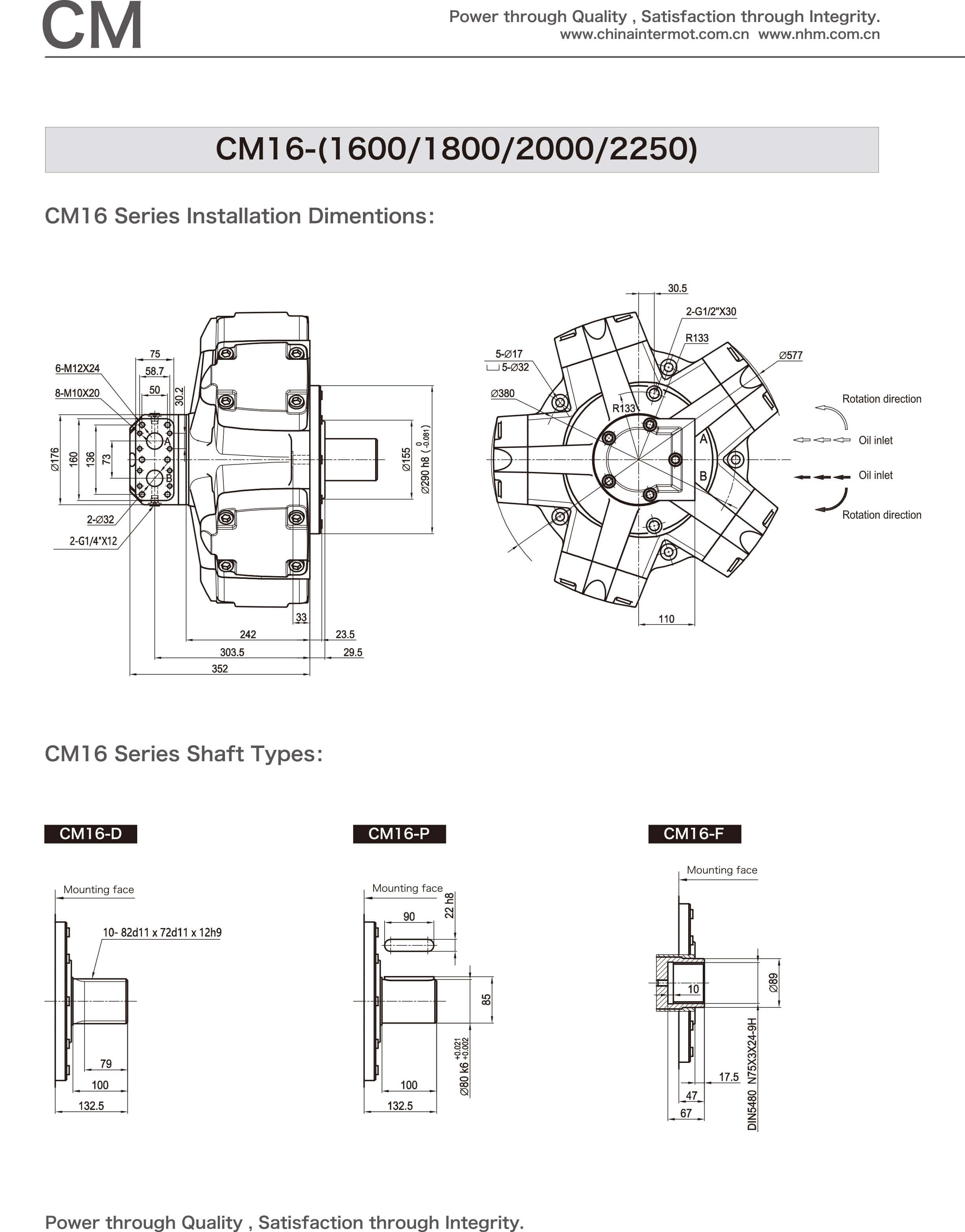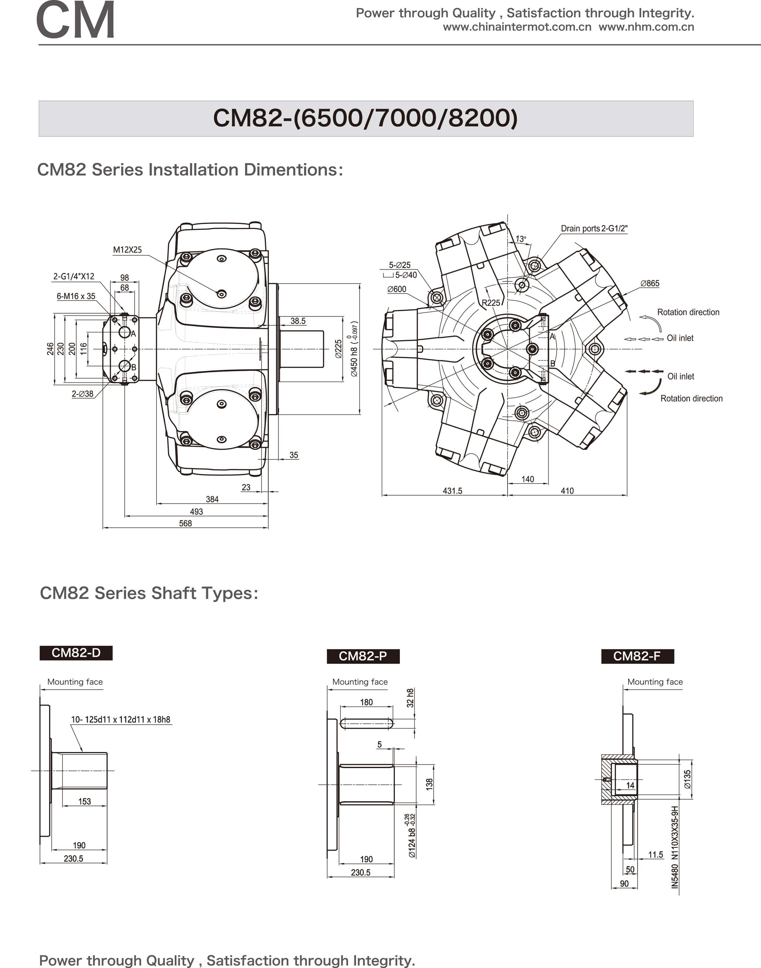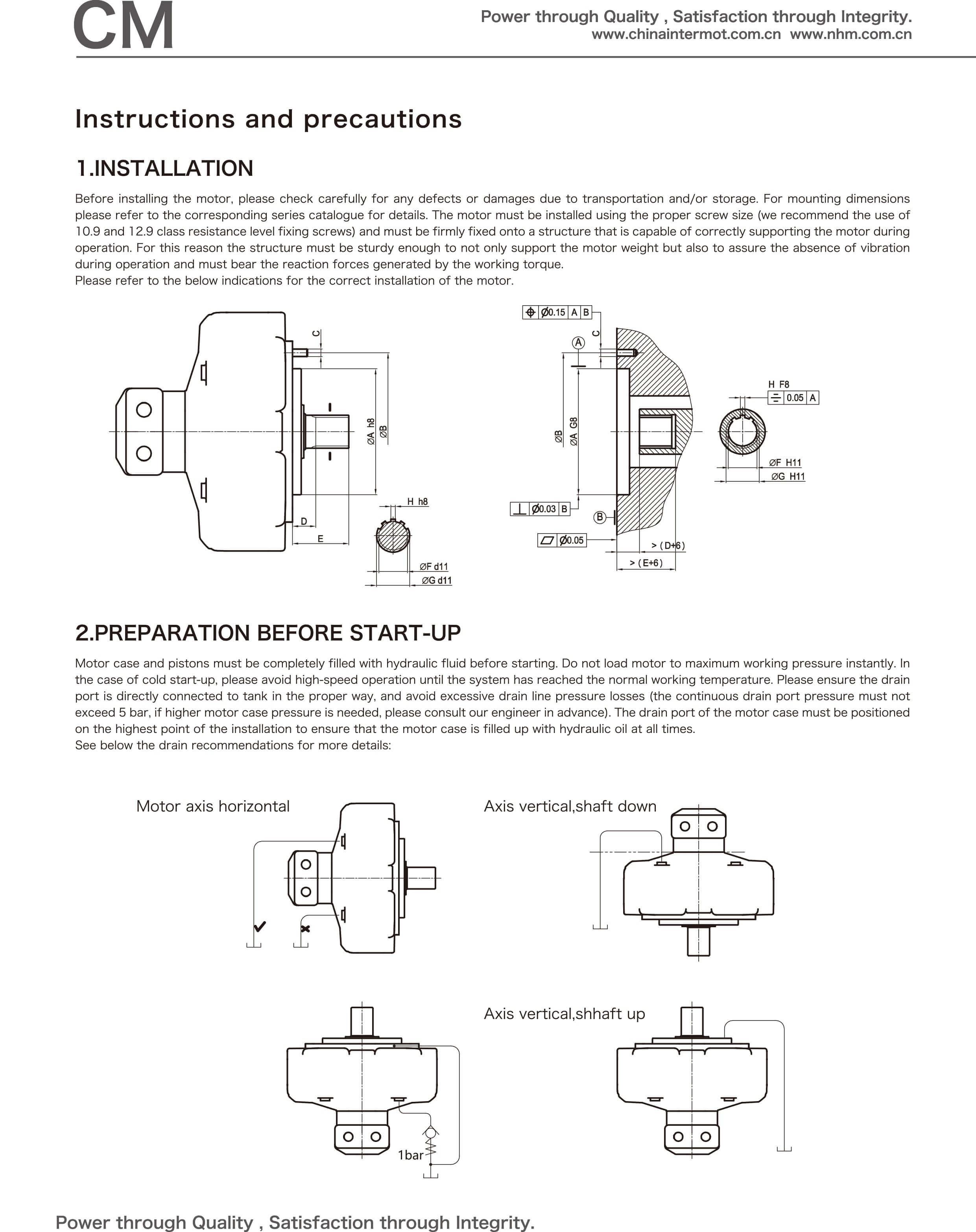 CM series hydraulic motors are new structural hydraulic motors introduced by our company. These motors have the advantages of high reliability, high efficiency, long life, low noise, large displacement and wide speed range, so that they can be widely used in the hydraulic transmission systems in a number of industries such as marine, plastic machinery, mining, construction, metallurgy, petroleum, and geological prospecting, etc..
