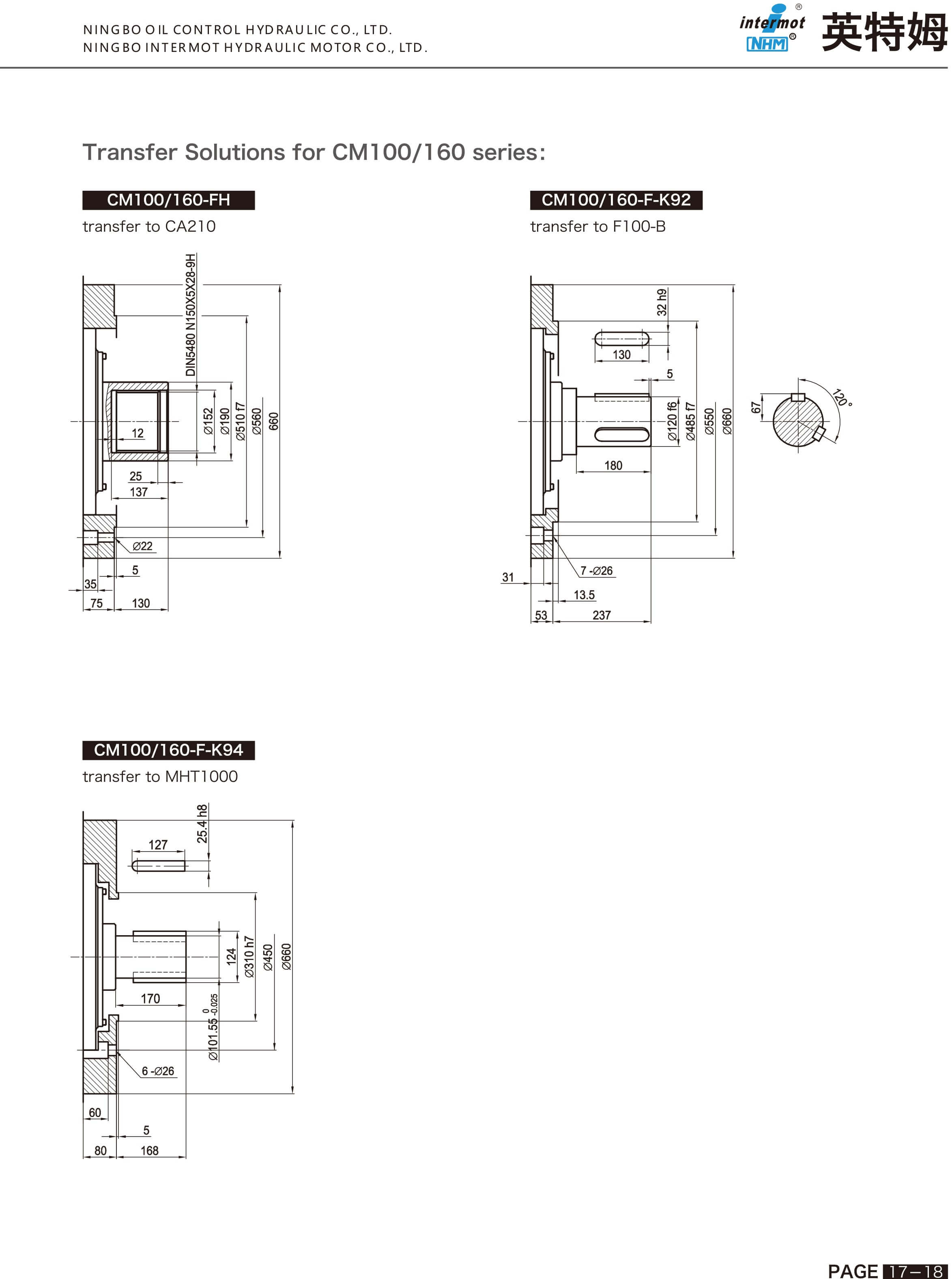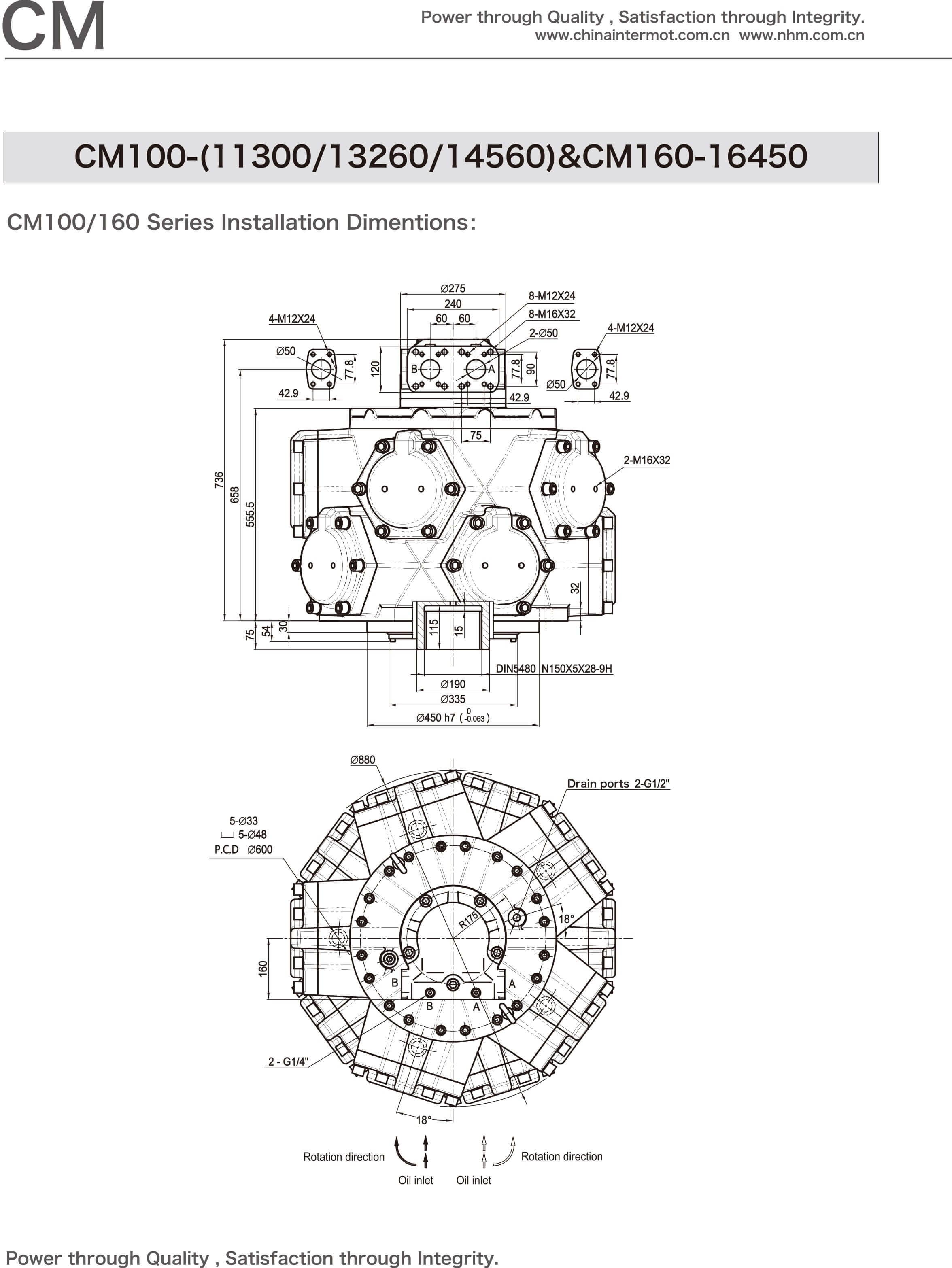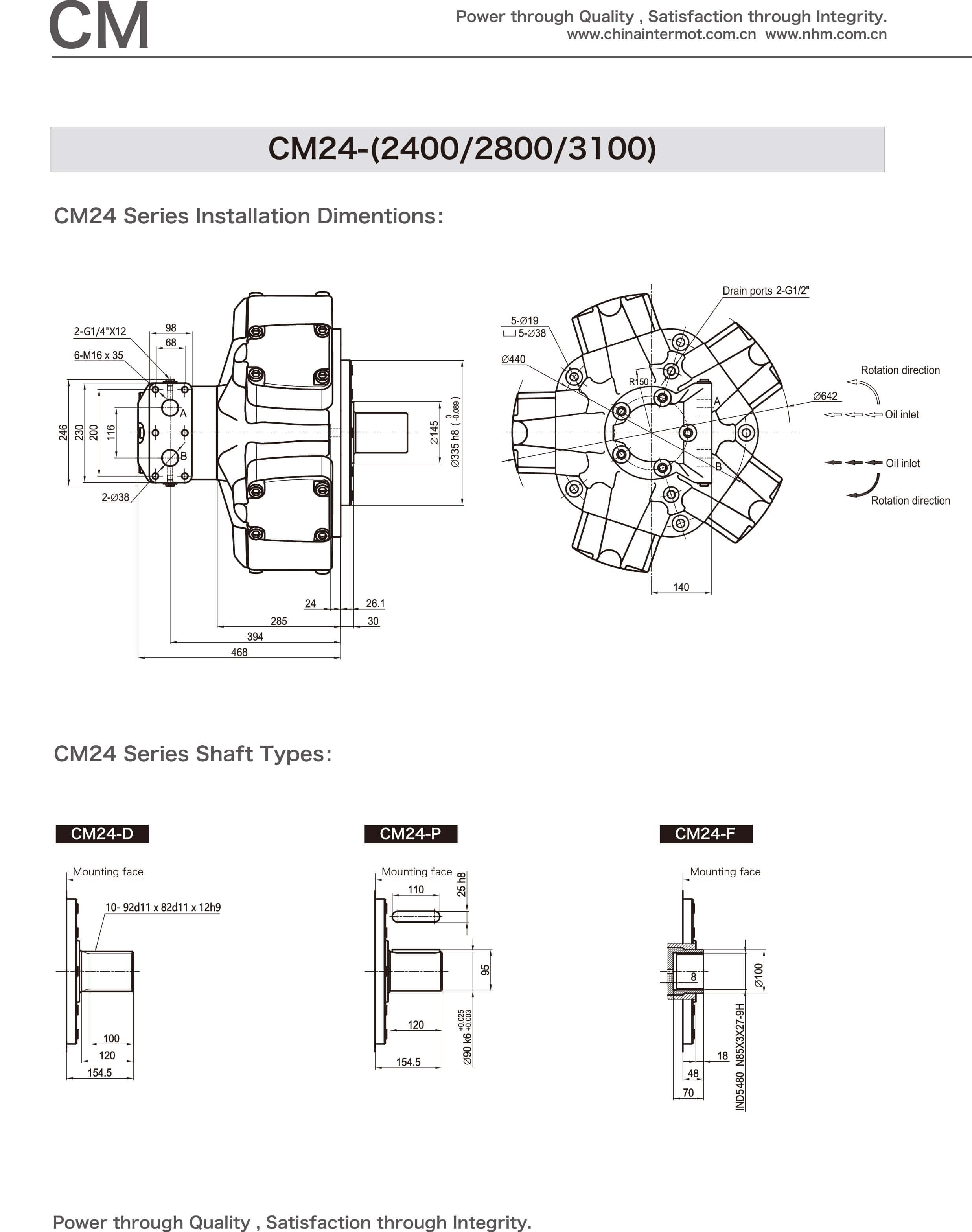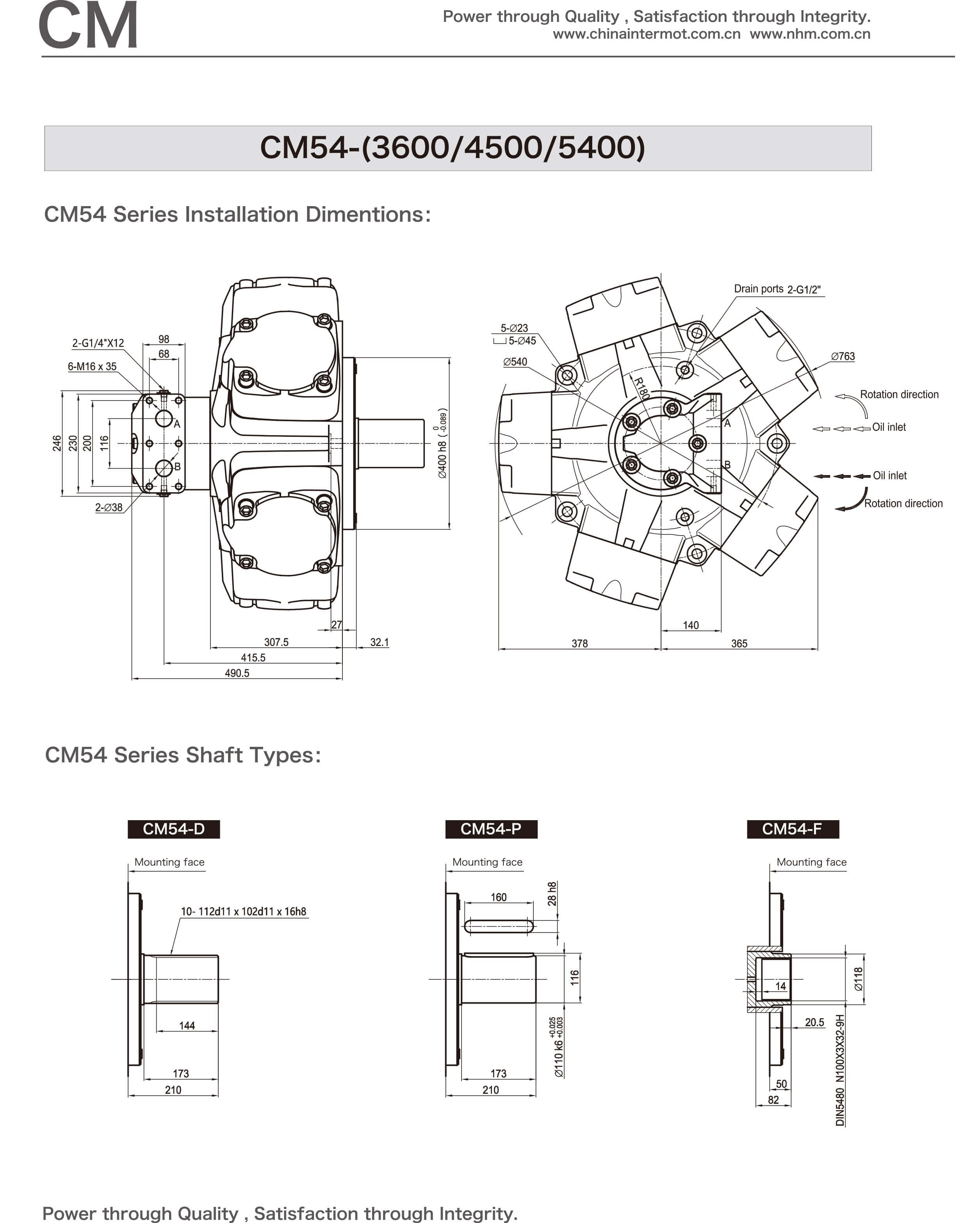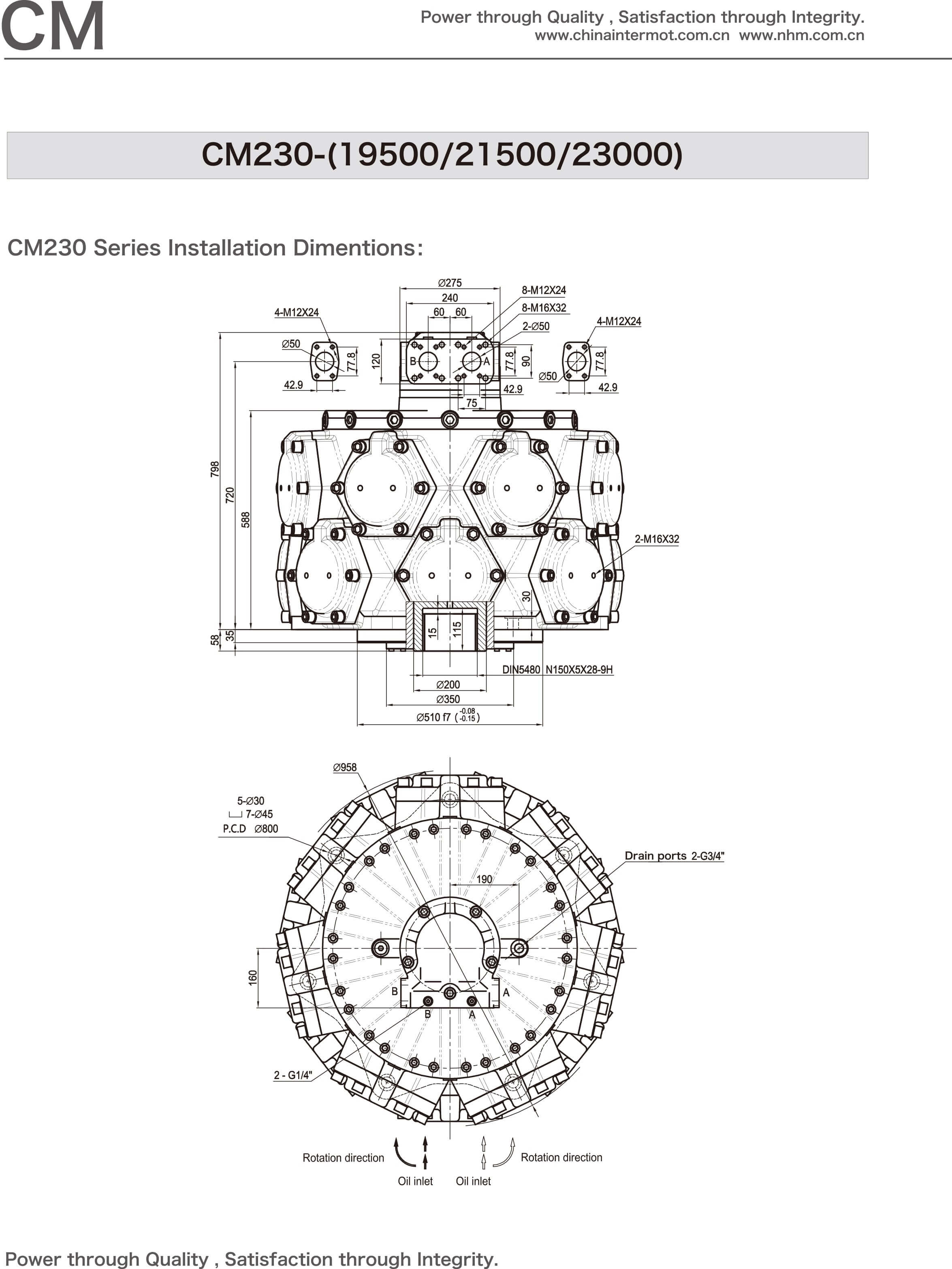 CM series hydraulic motors are new structural hydraulic motors introduced by our company. These motors have the advantages of high reliability, high efficiency, long life, low noise, large displacement and wide speed range, so that they can be widely used in the hydraulic transmission systems in a number of industries such as marine, plastic machinery, mining, construction, metallurgy, petroleum, and geological prospecting, etc..