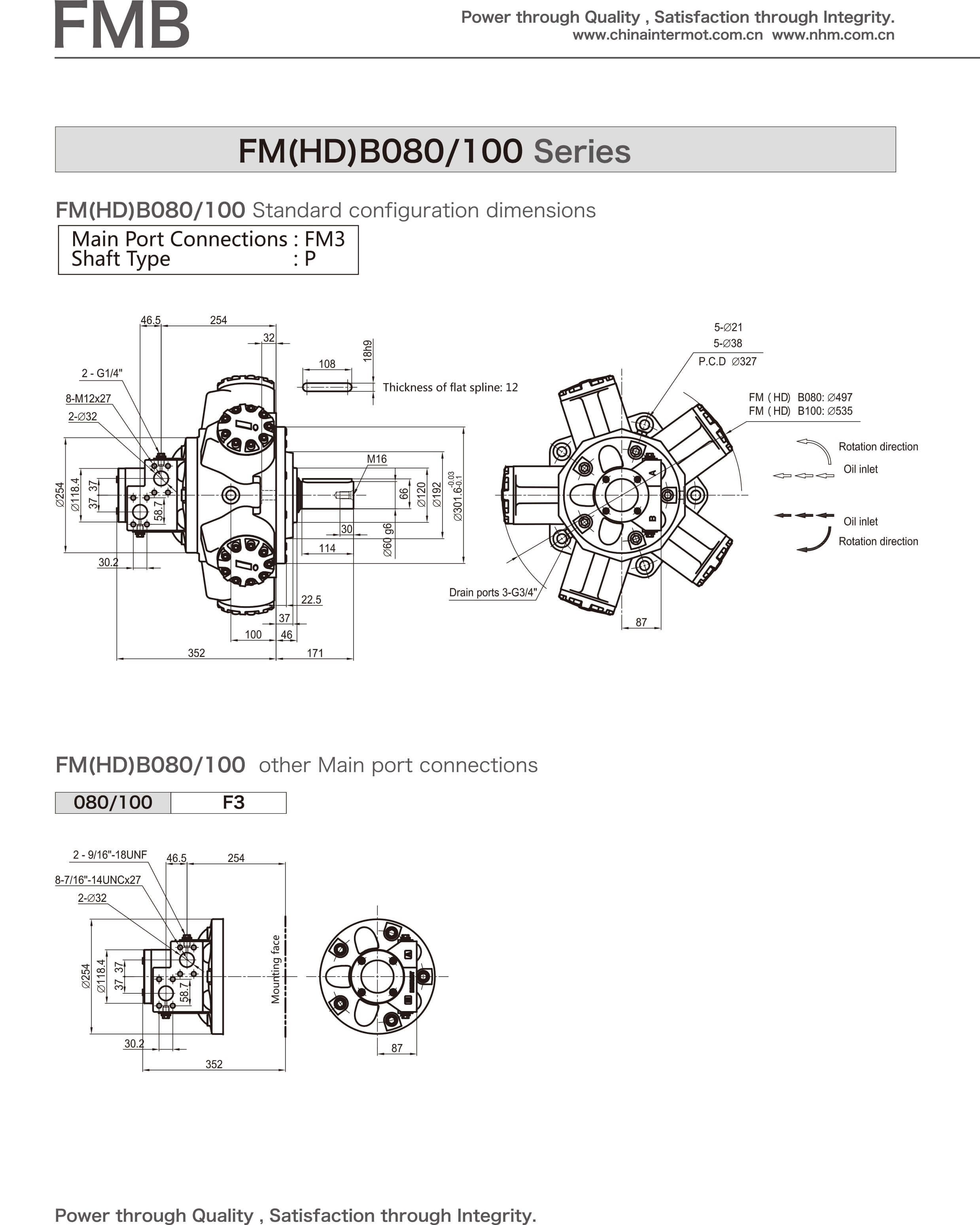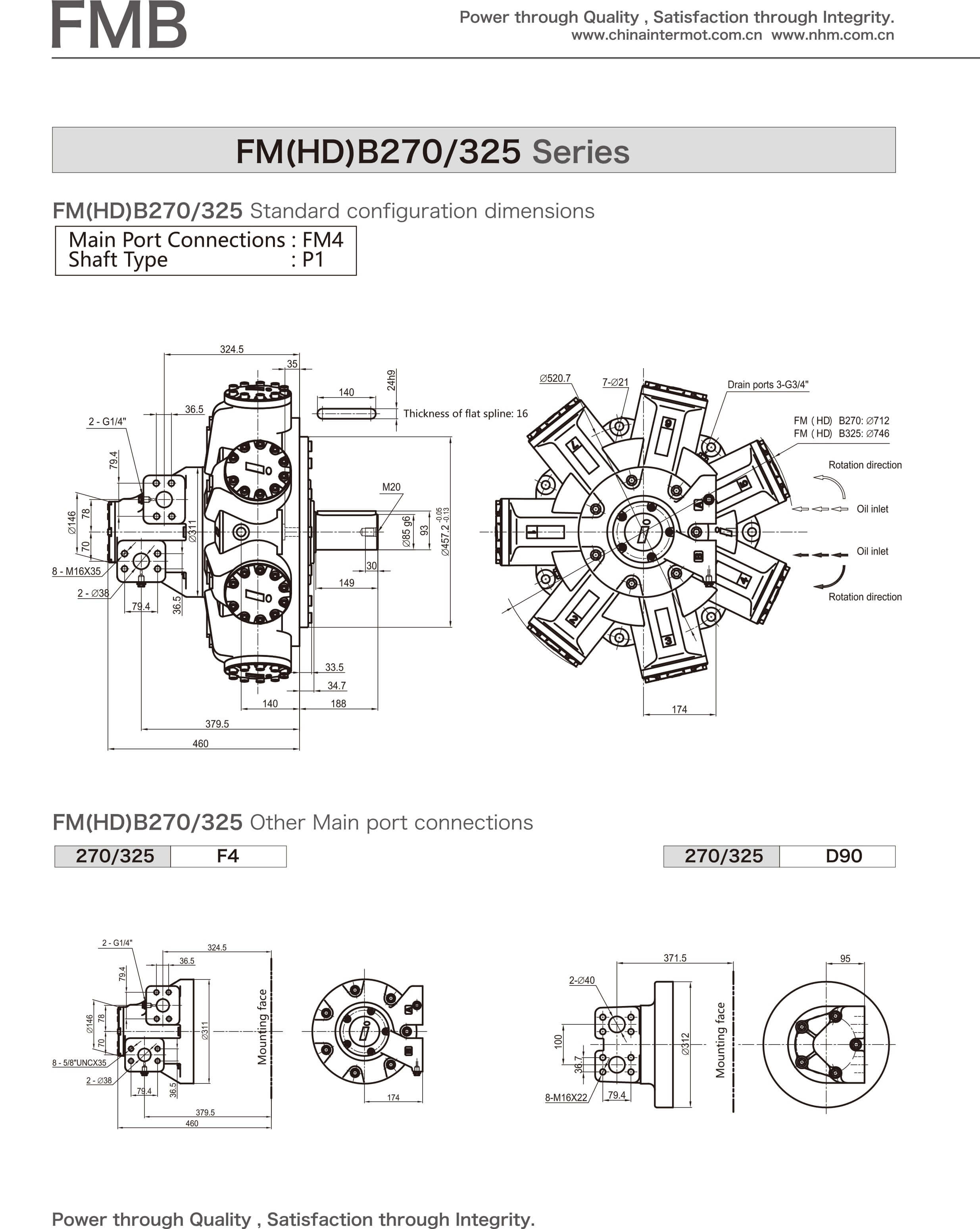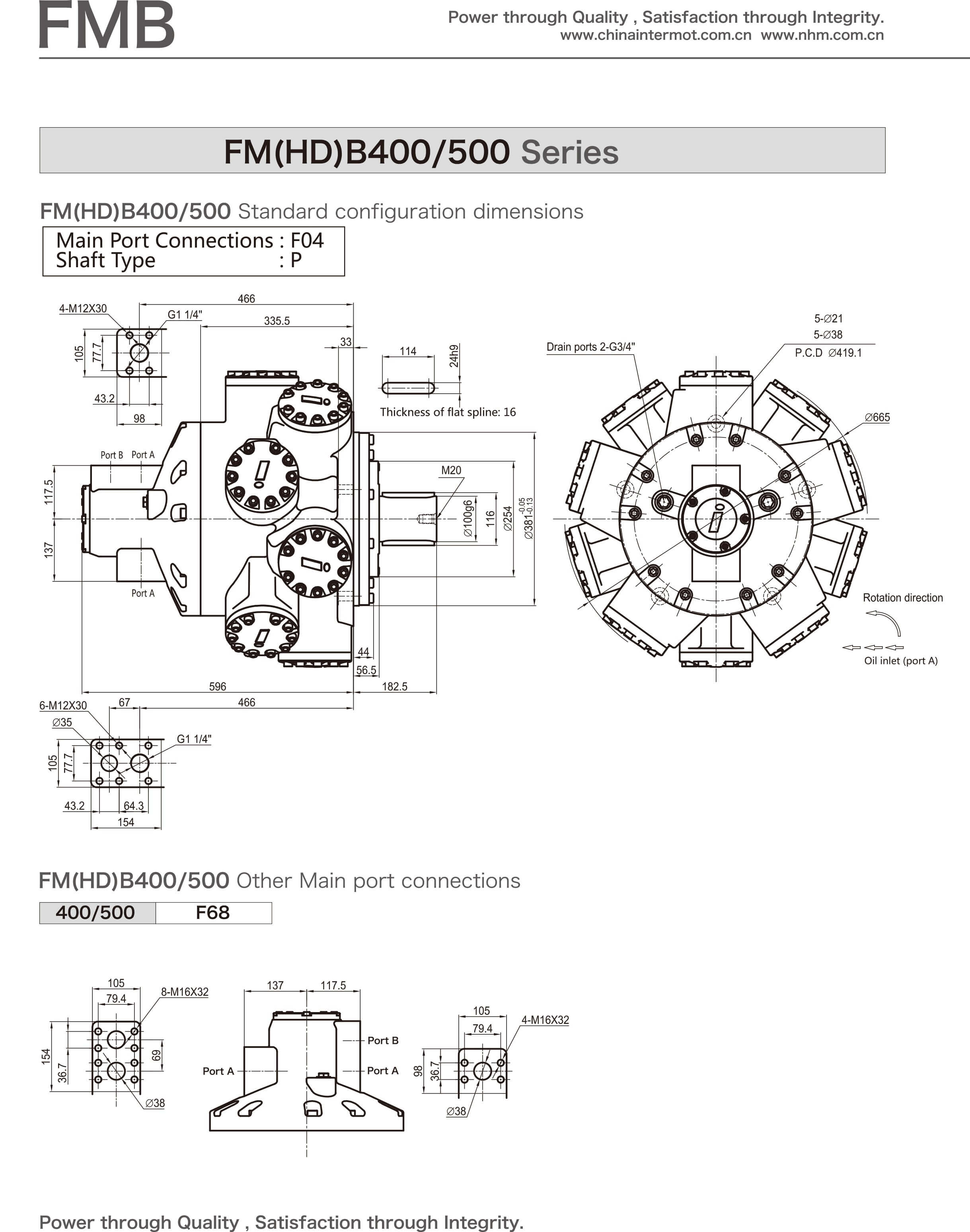 FMBseries hydraulic motors, recently launched products with new structures of the company, embody years of experi- ences of INTERMOT in manufacturing hydraulic motors and enjoy the advantages of internal/external crank shaft hydraulic motors worldwide , which contributes to the significant enhancement of pressure grade and speed range of hydraulic motors. The motors falling into this series are characterized by outstanding reliability, high efficiency, long service life, low noise level and wide speed range, etC., so that they widely used in the hydraulic transmission systems in a number of industries such as marine, plastic machinery, mining, construction, metallurgy, petroleum, and geological prospecting, etc..