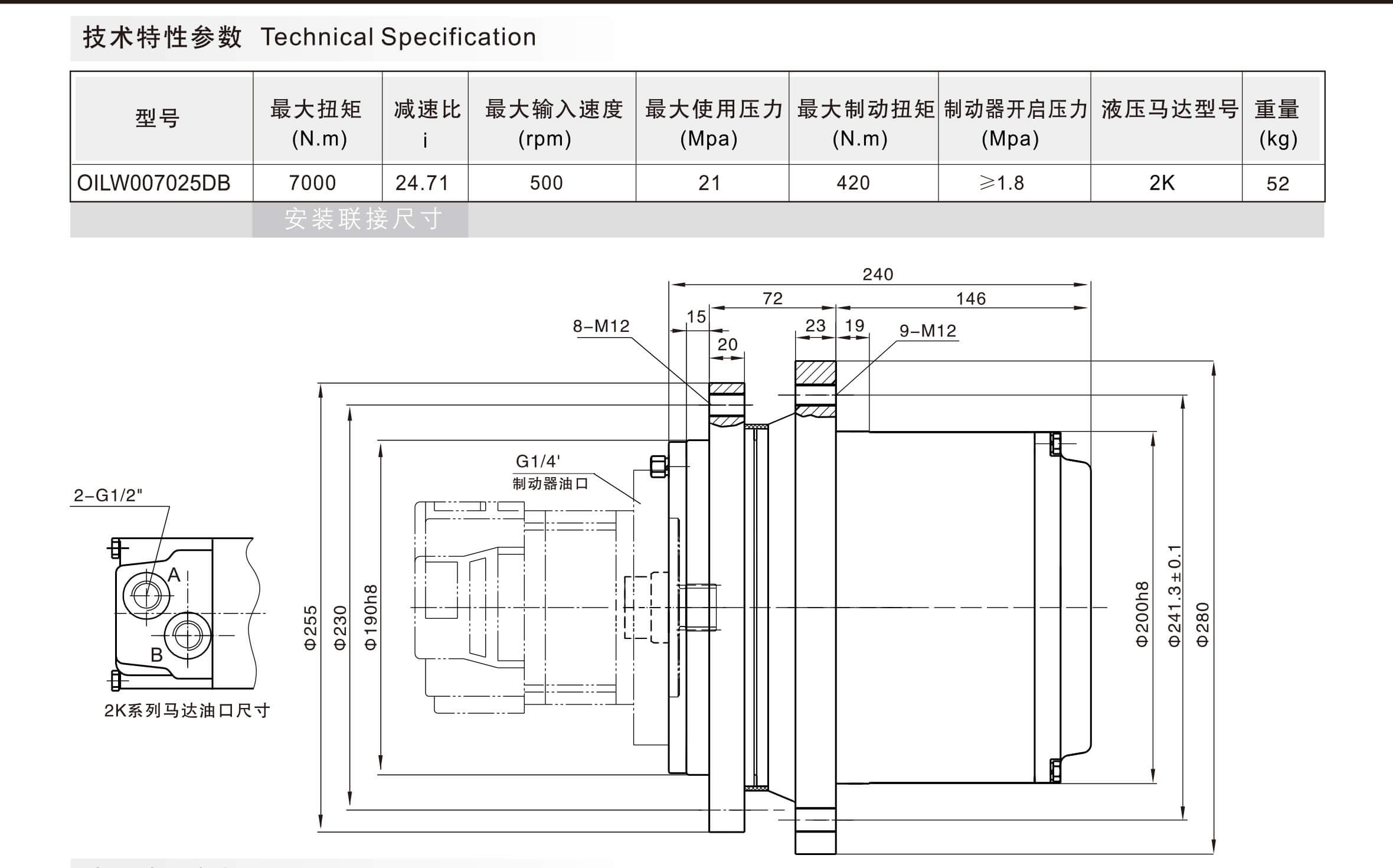 | 型号 | 最大扭矩 (N.m) | 减速比 i | 最大输入速度 (rpm) | 最大使用压力 (Mpa) | 最大制动扭矩 (N.m) | 制动器开启压力 (Mpa) | 液压马达型号 | 重量 (kg) |
